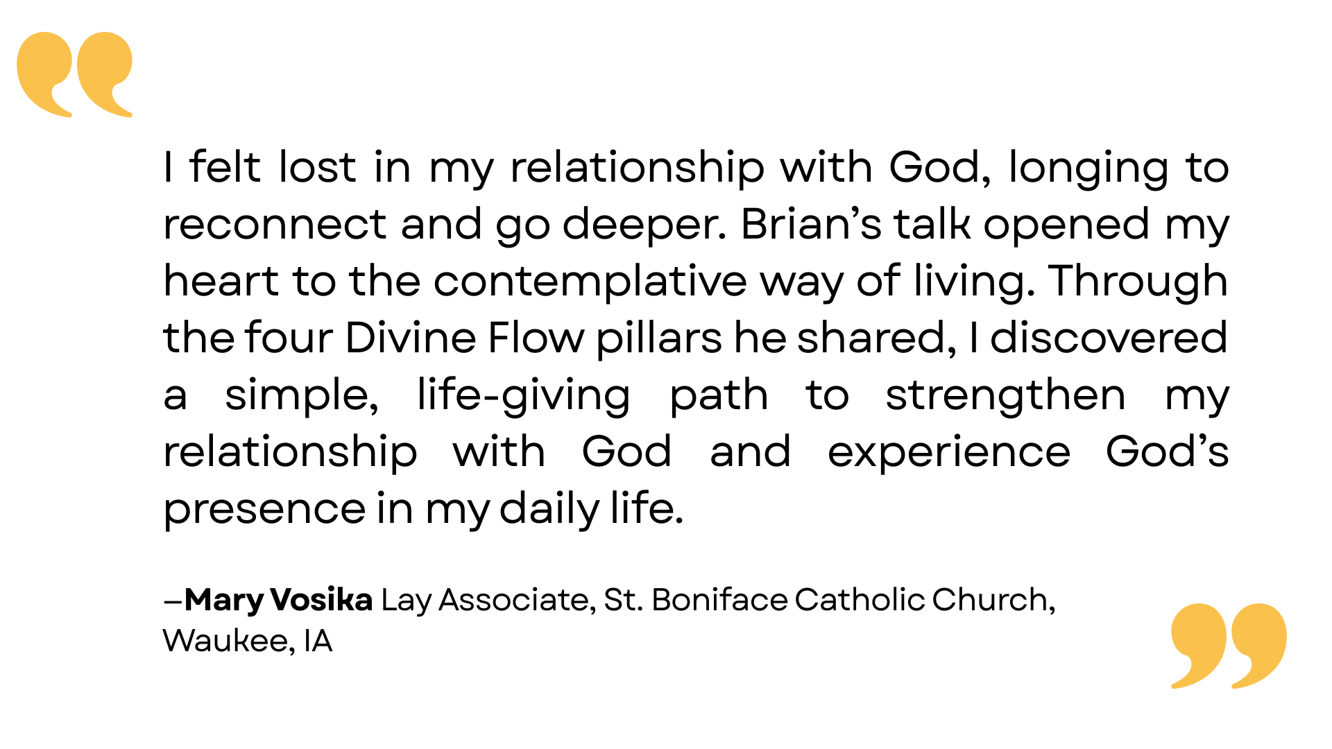 In this keynote talk, Brian introduces the contemplative path of divineFlow—a way of life that helps us recognize God’s presence through quiet time, spiritual reading, discovering our spiritual gifts, and walking with others in community. Listeners leave with renewed hope and simple tools to experience God’s presence in everyday life.