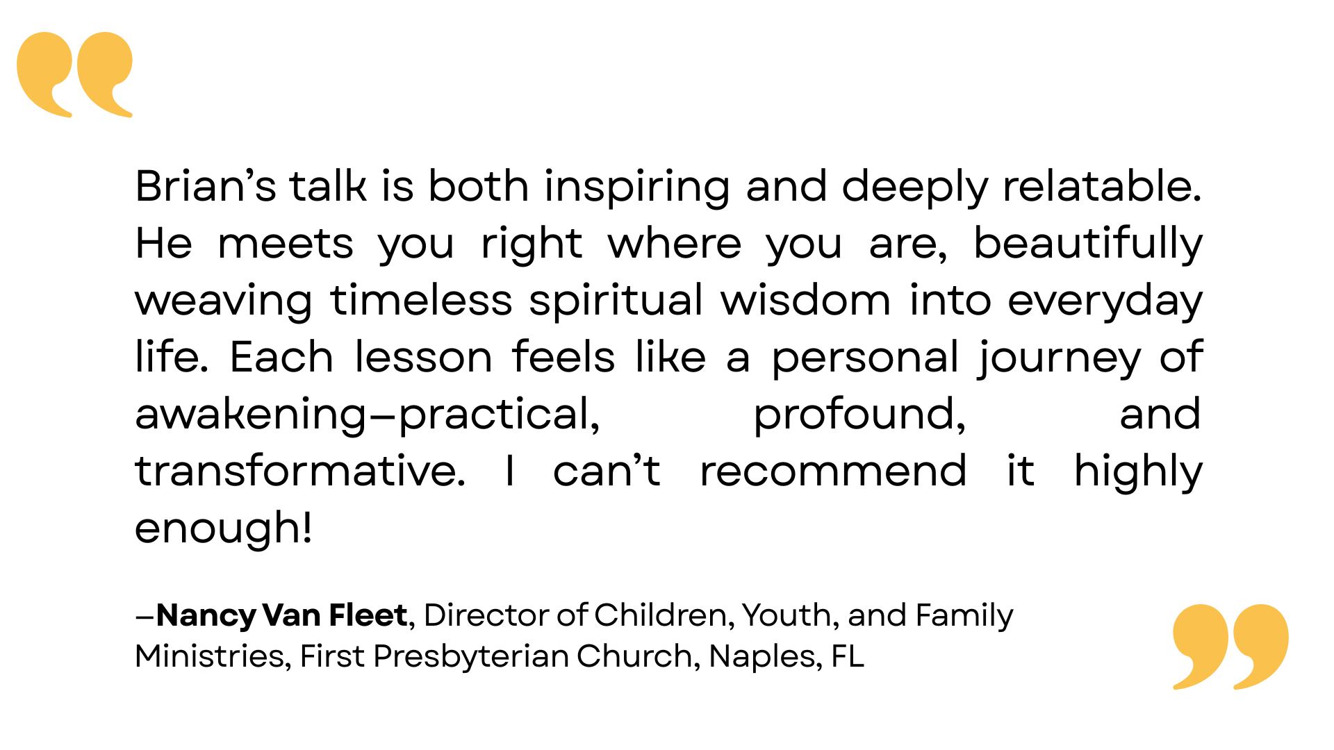 Every person carries a unique reflection of God’s creativity. Brian’s engaging teaching helps audiences recognize their spiritual gifts, understand their purpose, and live out their calling with confidence and gratitude. It’s an invitation to serve God from who you truly are.